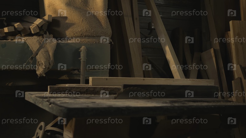 Сосредоточенный ремесленник тщательно направляет древесину через пилу с помощью извлечения пыли и организованных досок в поле зрения