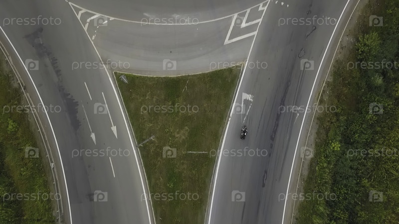 Вид сверху из воздуха мотоциклиста, едущего по круговороту