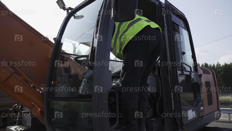 Строительный работник входит в кабину экскаватора на дорожном участке
