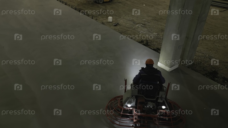 Строительный работник, использующий прогулку на электрической трофе для завершения бетонной плиты