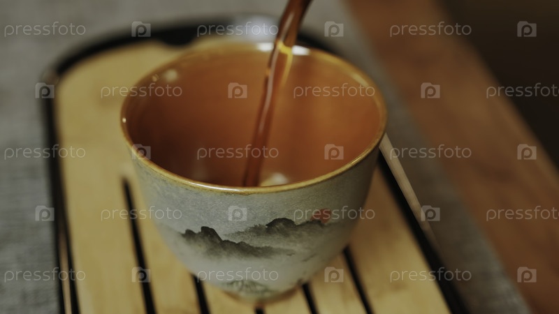 Спокойный и спокойный момент, красиво захватывающий успокаивающий акт наливания чая в изготовленную кубку.СМИ