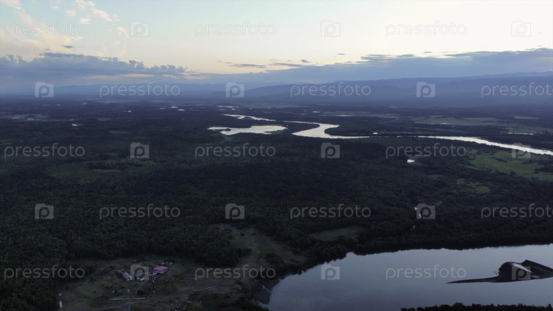 Вид с воздуха леса речной долины и далеких гор.СМИ