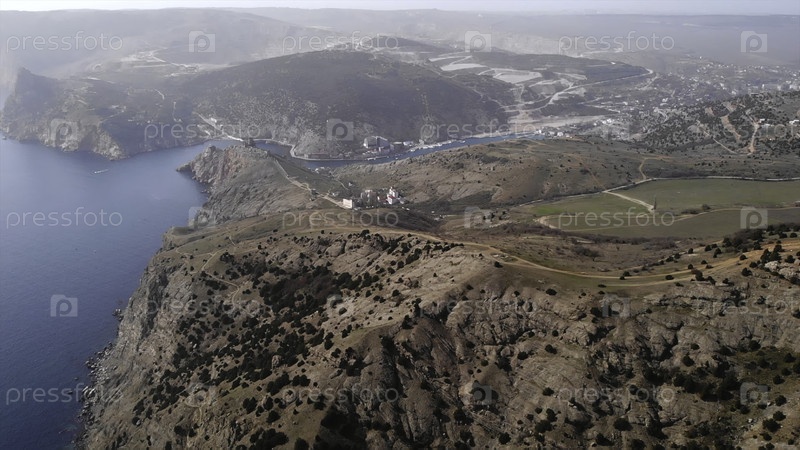 Вид с воздуха, летящий над побережьем залива Балаклавы