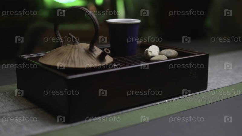 Спокойная чайная конфигурация, в которой есть чайник, элегантная чашка и красивые декорации с успокаивающим зеленым освещением окружающей среды