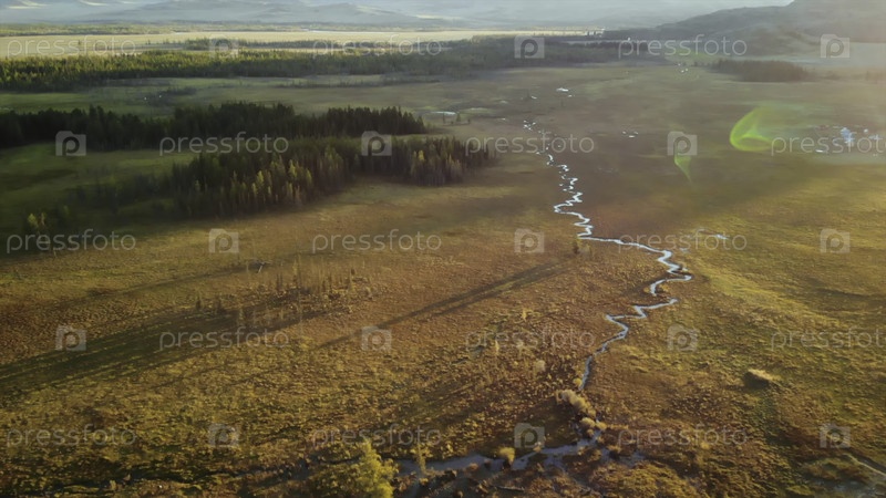 Вибрирующая река течет через обширные болота на закате