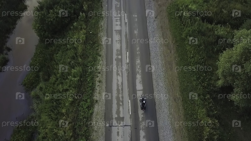 Аэрофотосъемка сверху мотоцикла, едущего по сельской дороге