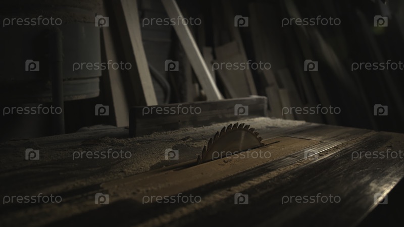 Мастерская увидела сцену, мастерская установка показывает светящиеся вырезы лезвие среди пыли и сложенные деревянные доски. СМИ