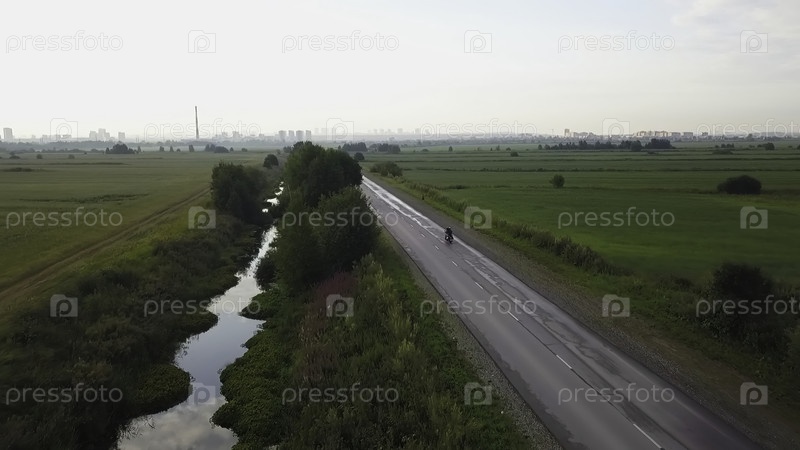Аэрофотосъемка мотоциклиста, едущего по сельской дороге