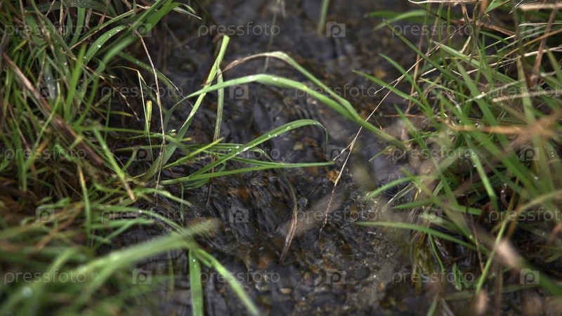 Подробности о дождевом поле, Ближайшее изображение влажного травянистого пятна, макровизуальная картина политой дождем земли и зелени