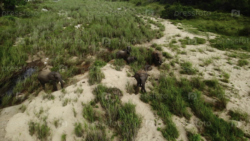 Авиазапись, изображающая семейные слоны, мигрирующие по засушливому ландшафту с видимыми следами ног