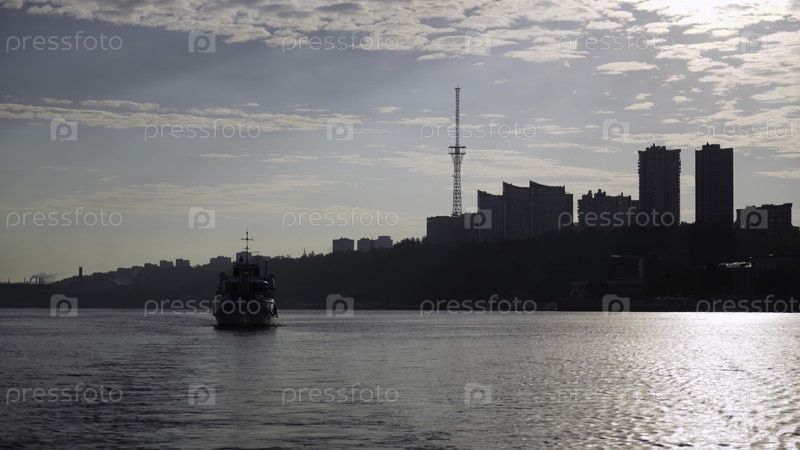 Пассажирский паром, плавающий по реке в направлении современного городского пейзажа