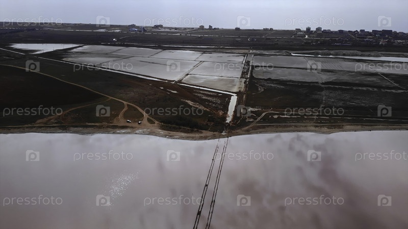 Вид с воздуха, летящий над розовым соляным озером и прудами испарения