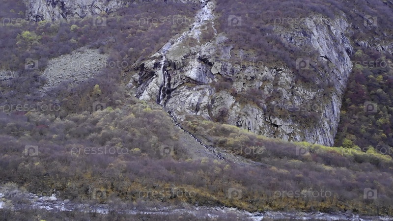 Горный водопад течет вниз по скалистым обрывам.СМИ