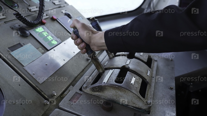 Капитан управляет рычагами на панели управления мостом корабля