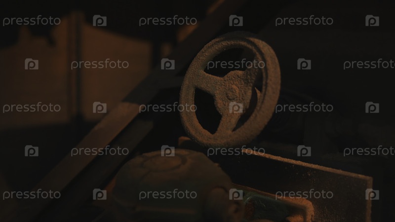 Ржавое ручное поворотное колесо в старой промышленной среде, купающееся в нежном оранжевом освещении и тени