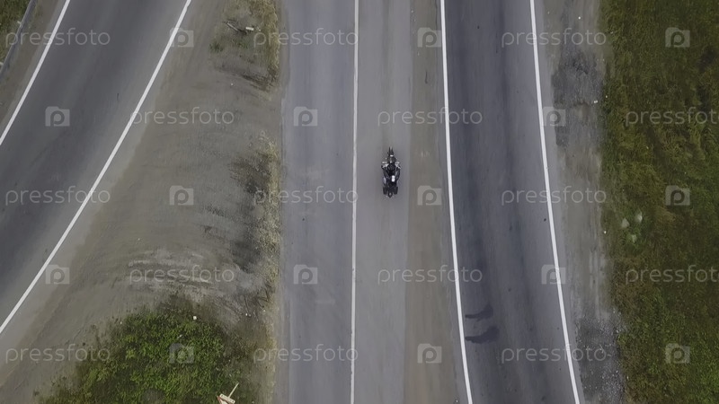 Вид сверху из воздуха мотоциклиста, едущего на мотоцикле по шоссе