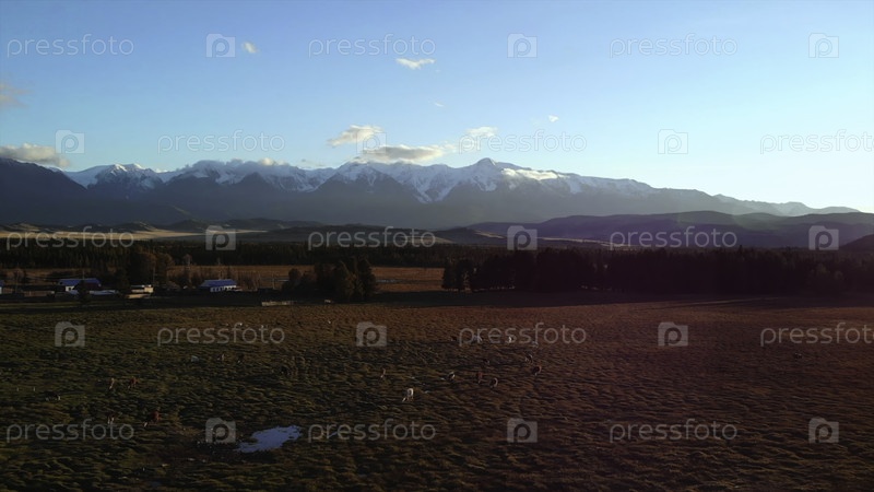 Коровы мирно пасутся в горной долине на закате.СМИ