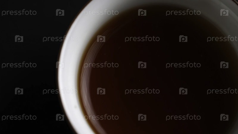 Ближайший снимок вкусной чашки, наполненной богатым и ароматным чаем, подчеркивая его глубокий оттенок на темном фоне