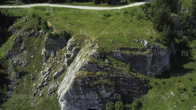 Вид с воздуха показывает прочное скальное образование, окруженное яркой зеленью и высокими деревьями в живописном пейзаже
