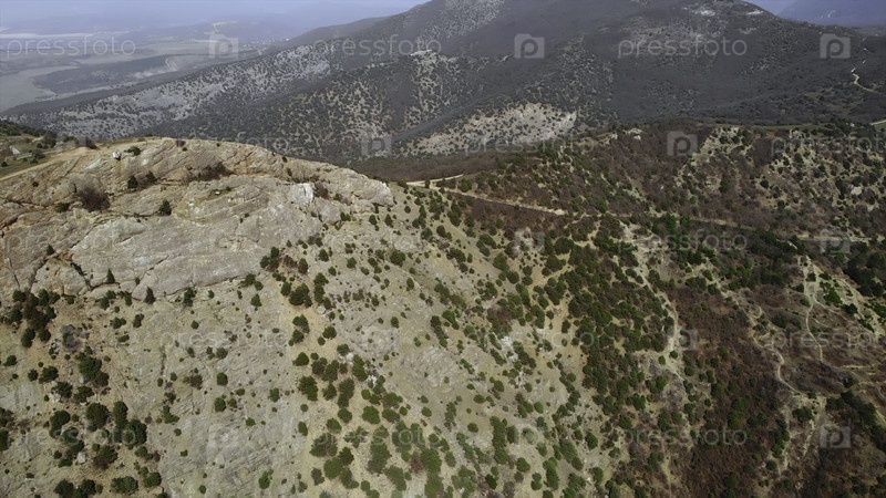 Вид с воздуха, летящий над холмистым пейзажем и горами