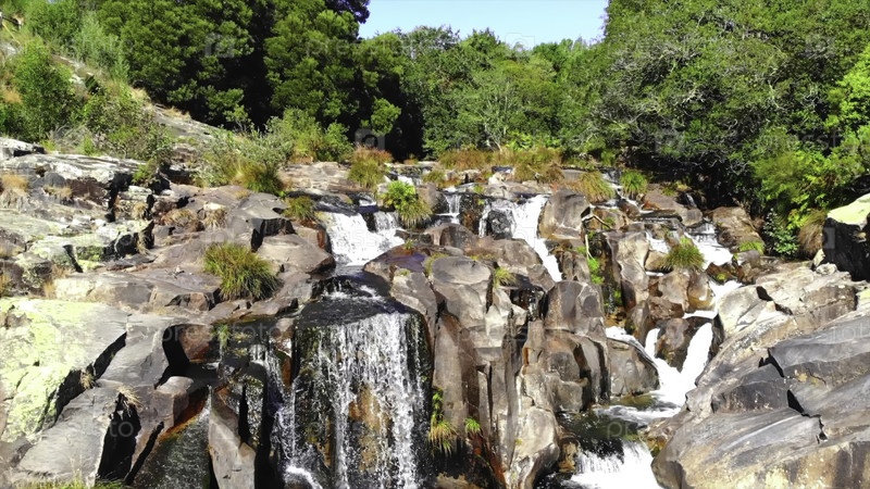 Вид с воздуха, улетающий от каменистого водопада и естественного бассейна