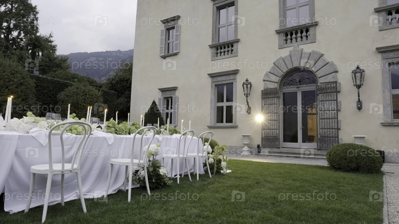 Элегантный стол для свадебного приема перед виллой