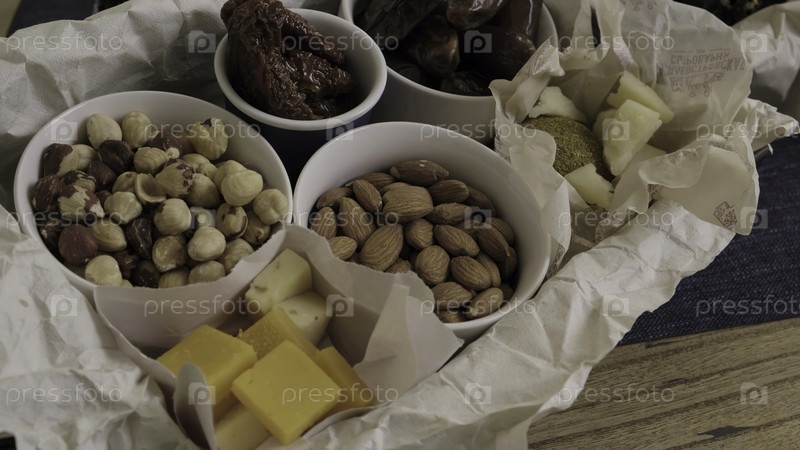 По-настоящему восхитительный ассортимент гурманских орехов, сладких дат и богатого сыра подается элегантно в обаятельных контейнерах