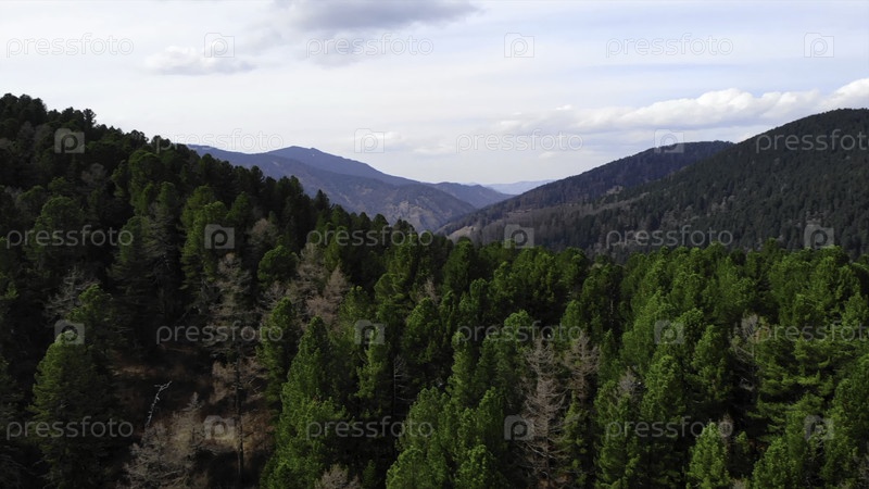 Зеленый хвойный лес покрывает склоны горного массива