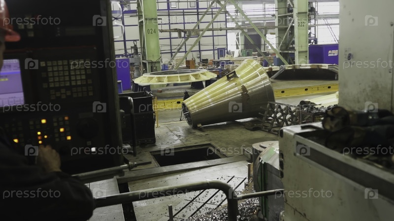 Фабричный работник, работающий с ЦНК-машиной для производства металлических деталей