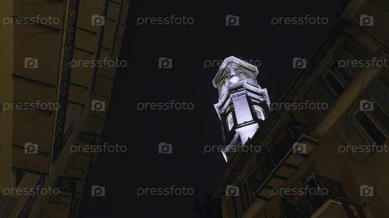 Величественная освещенная колокольня, возвышающаяся над зданиями ночью