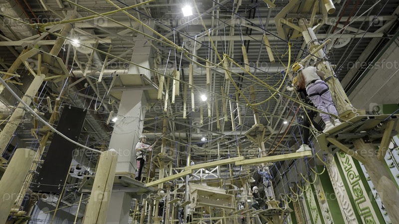 Женщина осторожно пересекает висячий мост в крытом приключенческом парке