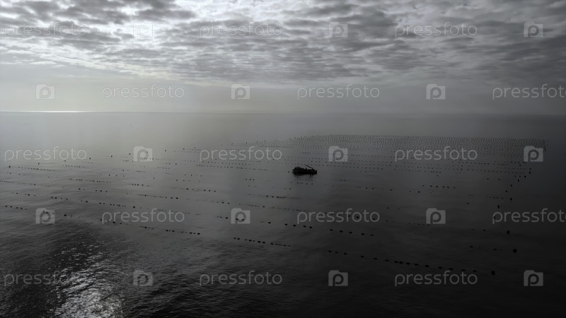 Одинокий корабль на сером море, одинокое судно плавает в тихом океане под облачным небом и мягкими волнами