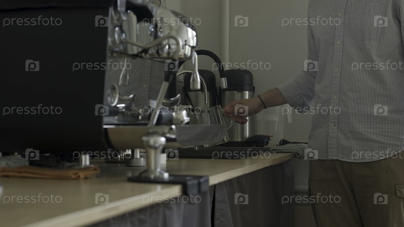 Талантливый бариста готовит вкусный кофе на эспрессо-машине в уютном кафе