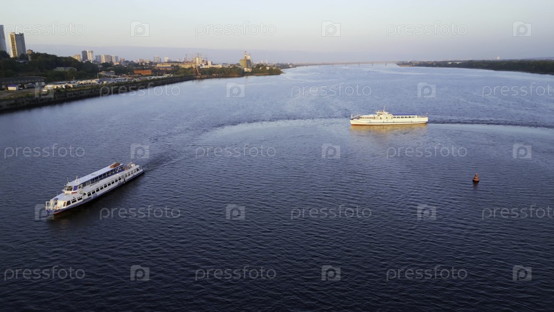 Пассажирский паром, плавающий по реке на восходе солнца возле городского побережья