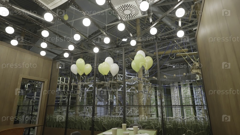 Уютное и яркое пространство для мероприятий, которое демонстрирует красивые современные потолочные фонари вместе с красочными воздушными шарами