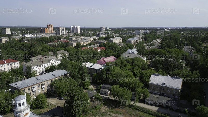 Вид с воздуха, показывающий жилой район с красочными крышами и зелеными деревьями