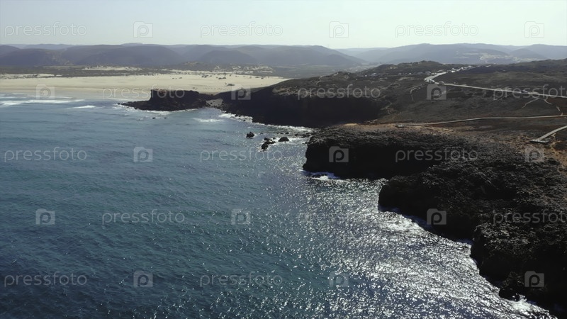 Обширные скалы встречают голубое море, захватывающий воздушный снимок драматического прибрежного пейзажа с успокаивающими волнами