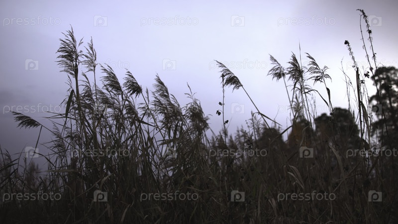 Туман среди болотистых растений, спокойный утренний туман окутывает водно-болотные насаждения и царит тишина