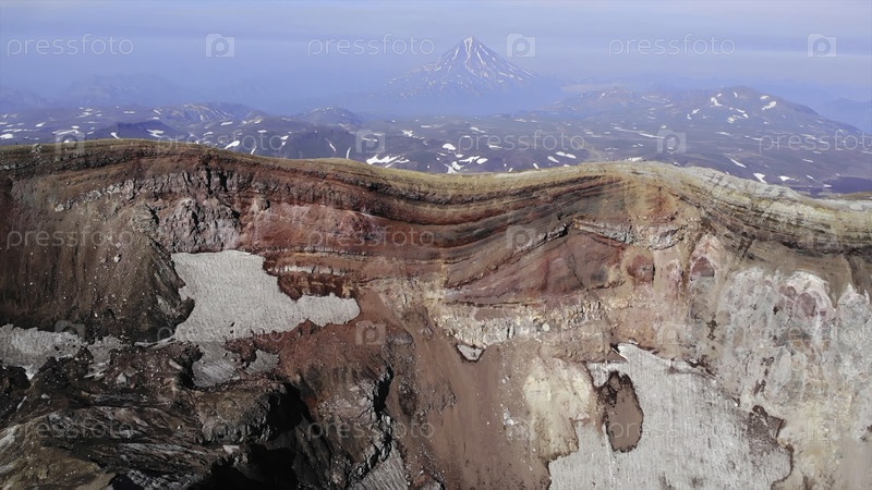 Вид с воздуха кратера горного вулкана с вулканом вилючик на расстоянии.СМИ