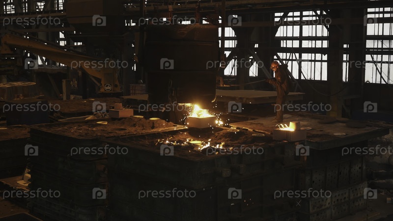 Работник литейной фабрики наливает расплавленный металл в форму