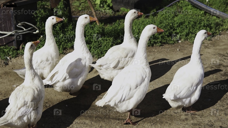 Группа веселых белых гусей счастливо наслаждается прекрасным солнечным днем в сельской местности