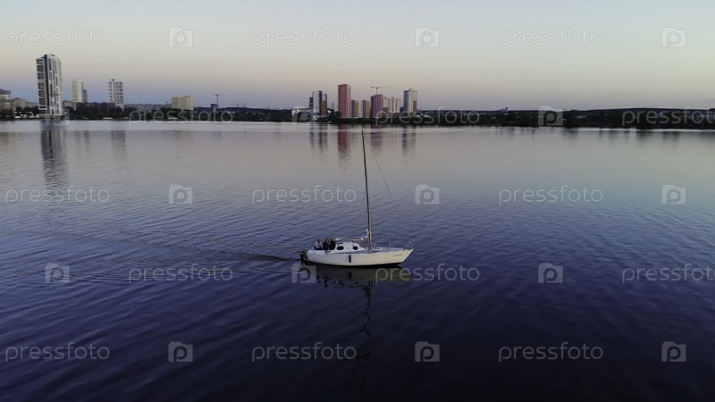 Небольшая парусная лодка плавает по спокойному озеру на закате