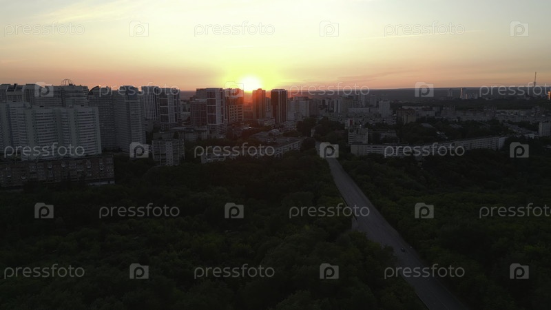 Воздушный закат города над городскими зданиями