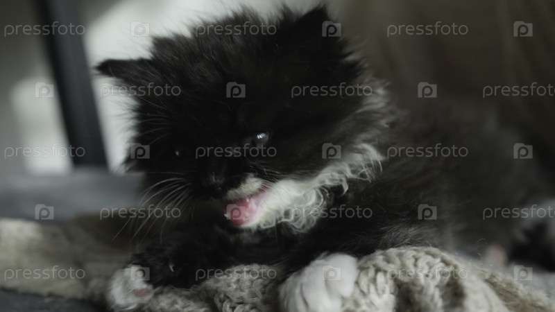Очаровательный пушистый черный котенок зевает и расслабляется