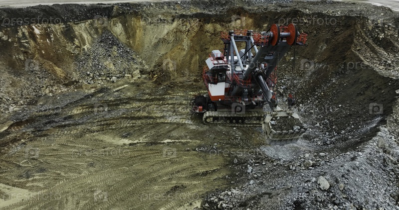Экскаватор загружает самосвалы в карьере