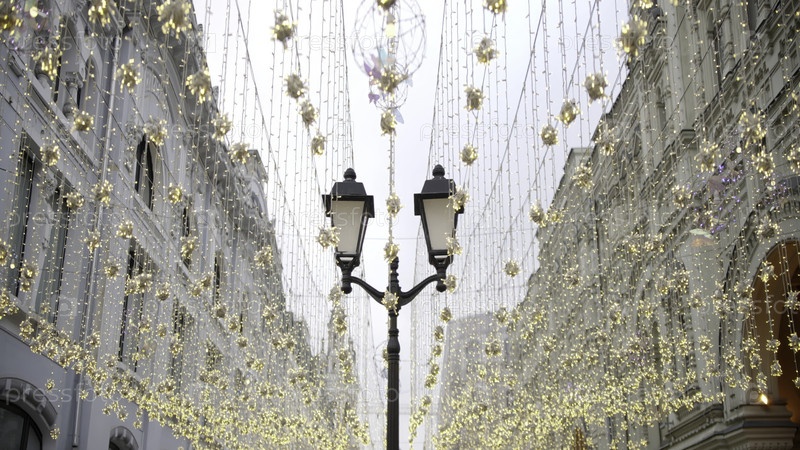 Рождественские огни, светящиеся над московской улицей на закате