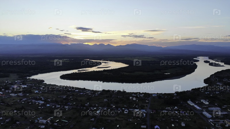 Прекрасный взгляд с воздуха на речную деревню при закате солнца