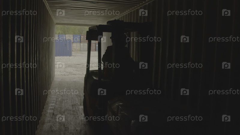 Вилочный погрузчик аккуратно перемещается через оживленный контейнерный коридор, демонстрируя сложность промышленной логистики