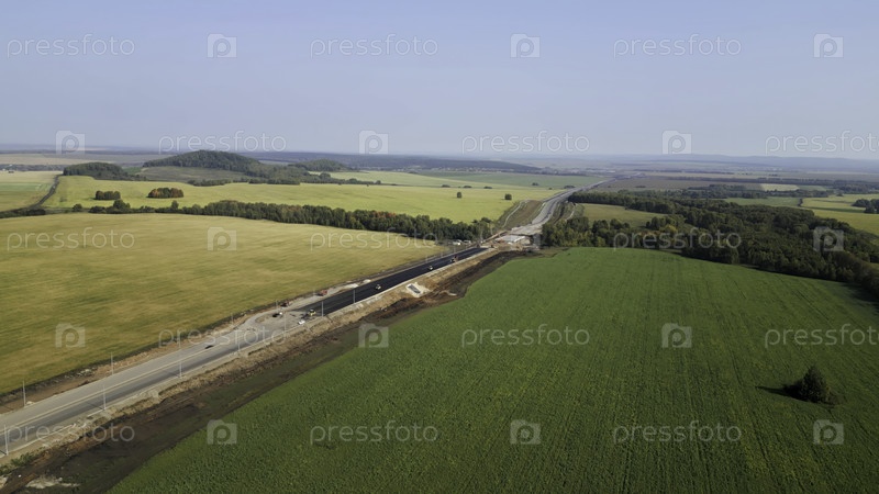 Строительство шоссе прогрессирует через сельскохозяйственный ландшафт