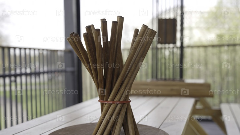 Это видео подчеркивает элегантное расположение палочек на деревянном столе, демонстрируя их дизайн, текстуру и культурное значение